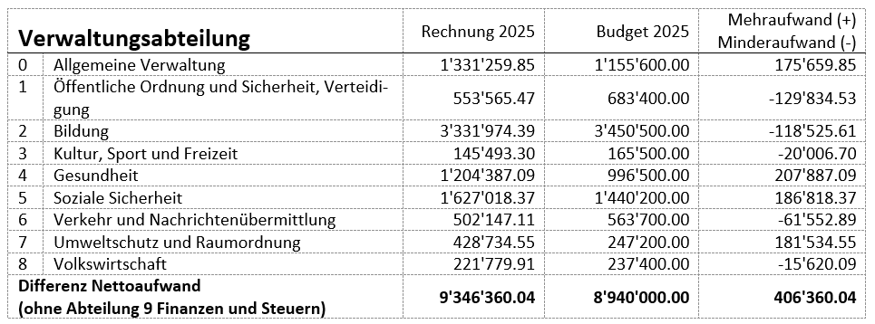 Der um rund CHF 380'000.00 schlechtere Rechnungsabschluss 2025 ist einerseits auf die Kostenbeteiligung an der wassertechnischen Erschliessung des Weiler Weissenbach, den massiven Mehrkosten im Bereich Gesundheit und soziale Sicherheit sowie ausserordentlichen Ausgaben mit Dringlichkeit zurückzuführen.