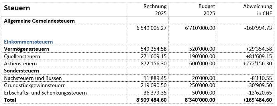 Die Rechnung 2025 der Einwohnergemeinde schloss mit einem Aufwandüberschuss von CHF 358'822.87 ab. Budgetiert war ein Ertragsüberschuss von CHF 17’200.00. Der Aufwandüberschuss konnte vollumfänglich aus den kumulierten Ergebnissen der Vorjahre entnommen werden.